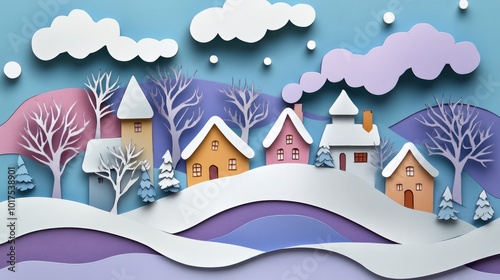 Naklejka premium Papercut-style winter village with snow-covered houses and trees, accented by...