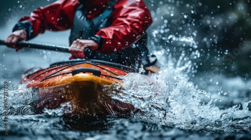 Naklejka premium Para-canoeist paddling, intense focus and water splashing