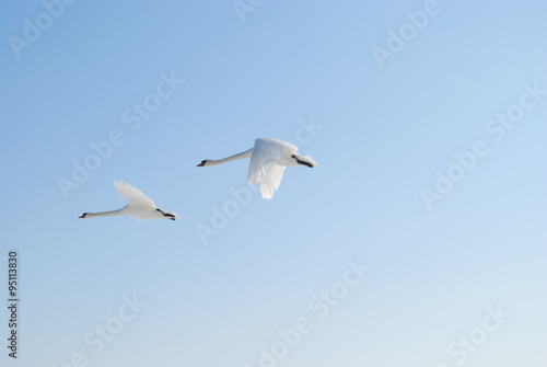 © Agata Kowalczyk, Obraz premium Para lecących łabędzi na tle błękitnego nieba