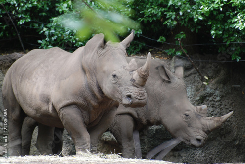 © dejavudesigns, Naklejka premium Para nosorożców stojących w cieniu drzewa