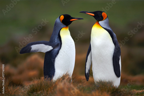 © ondrejprosicky, Fototapeta premium Para pingwinów. Krycia pingwiny królewskie z zielonym tłem na Falklandach. Para pingwinów, miłość w naturze. Piękne pingwiny w środowisku naturalnym. Dwa ptaki na trawie. Dwa pingwiny.