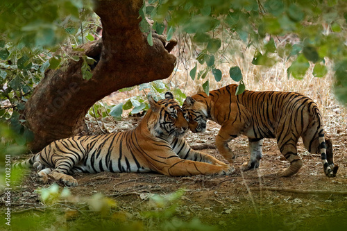 © ondrejprosicky, Fototapeta premium Para tygrysów indyjskich, samiec po lewej, samica po prawej, pierwszy deszcz, dzikie zwierzę, siedlisko przyrodnicze, Ranthambore, Indie. Duży kot, zagrożone zwierzę, powitanie kota. Tygrys r., Zielona roślinność. Dzika Azja.