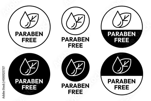 Naklejka premium Paraben Free with a leaf drop label, logo, badge, icon, sticker, symbol, emblem, stamp, green, line, flat vector, isolated illustration. Paraben Free label for product packaging design.