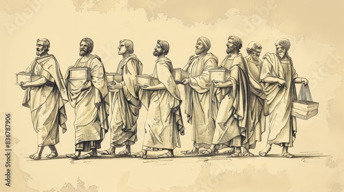 Fototapeta premium Parable of the Ten Minas Illustration: Servants Managing Money, Beige Background, Biblical Copyspace