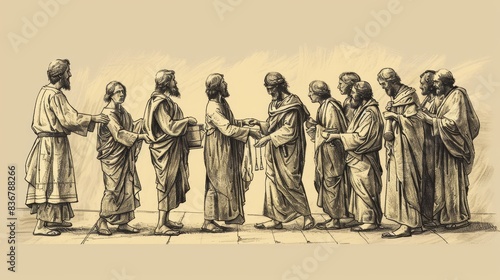 Fototapeta premium Parable of the Ten Minas Illustration: Servants Managing Money, Beige Background, Biblical Copyspace