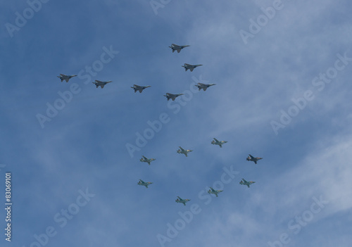 © Biskariot, Fototapeta premium Parade with team Swifts on Mig-29 and Russian Knights on Su-27