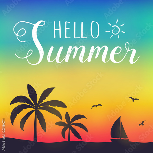 © Karolina Madej, Naklejka premium Paradise summer under palm trees. Shiny poster with text. Vector.