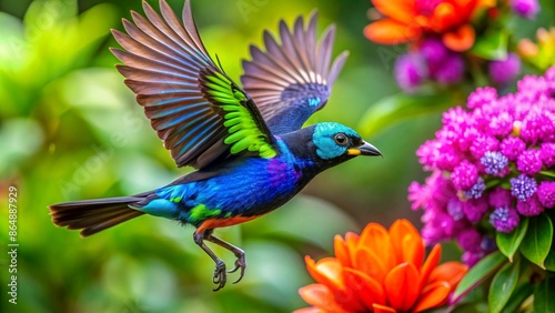 © Sunisadonphimai, Fototapeta premium Paradise Tanager The Jewel of the Rainforest flying flying near flowers