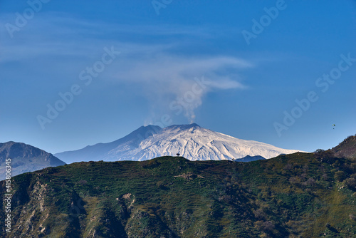 Fototapeta premium paragliding over the Etna volcano on a beautiful sunny day while the mountain...