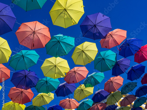 © Juanmi, Naklejka premium Paraguas de colores colgados en las calles de Malpartida