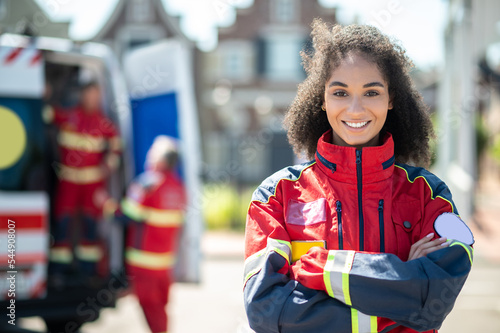 © zinkevych, Obraz premium Paramedic posing for the camera with colleagues on the background