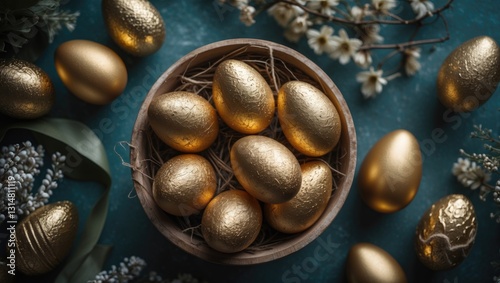 © AIArtistry, Obraz premium Paraphrased Title: "Top view of decorated golden Easter eggs in a bowl."
