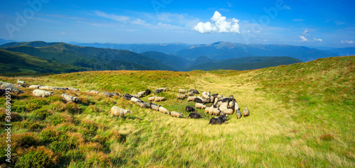 © panaramka, Fototapeta premium Parched lake and sheep in the alps