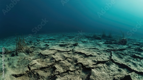 Fototapeta premium Parched ocean floor with cracked ground and remnants of marine vegetation.