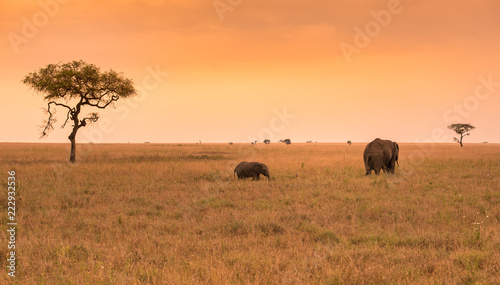 © Simon Dannhauer, Naklejka premium Parent African Elephant with his young baby Elephant in the savannah of Serengeti at sunset. Acacia trees on the plains in Serengeti National Park, Tanzania. Wildlife Safari trip in Africa.