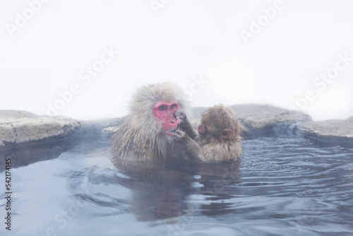 © mytree, Naklejka premium parent and child Japanese macaque monkeys bathing in a hot spring