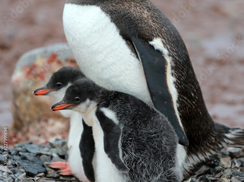 © Ralph, Naklejka premium parent Gentoo Penguin with two chicks on pebble nest, Cuverville Island, Antarctica