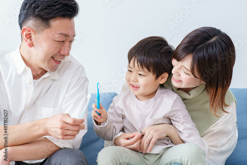 © maru54, Fototapeta premium Parents and child brushing teeth