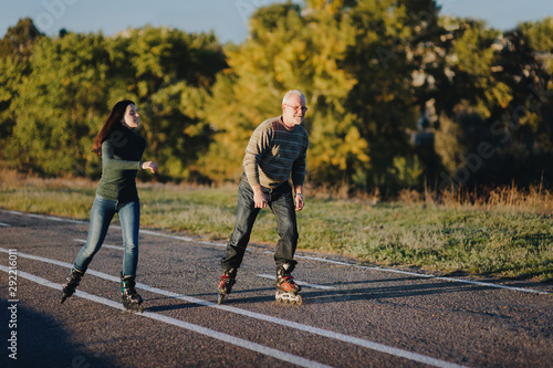 © shchus, Fototapeta premium Parents and children spend time together. Older generation and sport. Active lifestyle of the pensioner. Happy old man riding on rollers with his daughter on the road in autumn park.