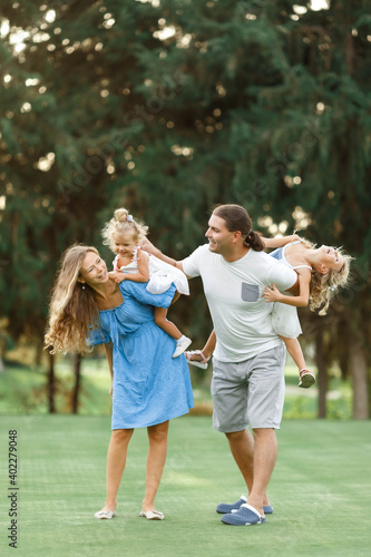 © Алина Битта, Fototapeta premium Parents Giving Children Piggybacks In Countryside, enjoing time together. Happy family concept. Blurred trees background.