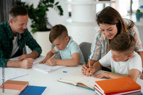 © JustLife, Fototapeta premium Parents helping the kids with their homework. Litlle boys learning at home.