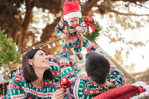 Obraz premium Parents lifting their baby in a santa hat, all wearing festive pajamas,...