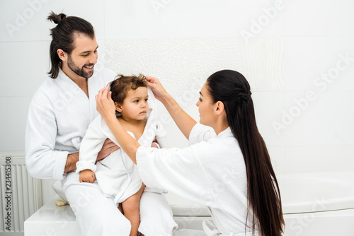 Obraz premium Parents sitting in bathroom with toddler son in white bathrobe
