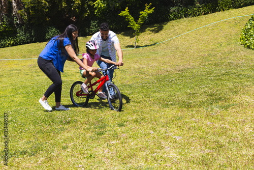 Fototapeta premium Parents teaching child to ride bicycle on grassy lawn, enjoying sunny day, copy space
