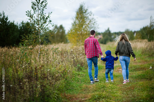 © Вячеслав Думчев, Fototapeta premium Parents walk with their little son on a country road, rear view. Copy space