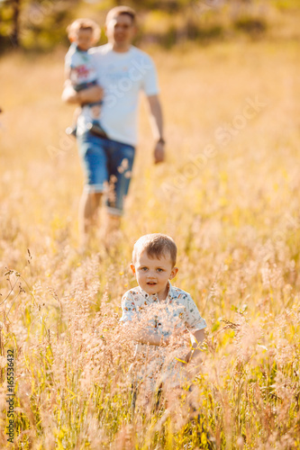 © pyrozenko13, Fototapeta premium Parents walks with their children on sunny field