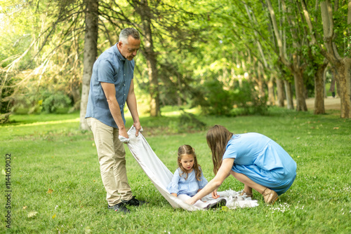 Fototapeta premium Parents wrapping daughter in blanket in park during summer day