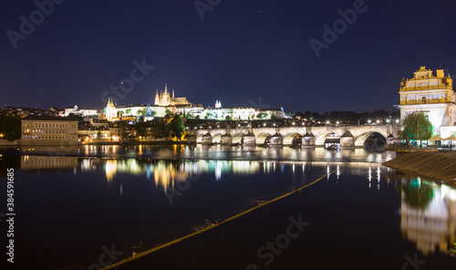 Obraz premium Pargue charles bridge and prague castle by night reflections river
