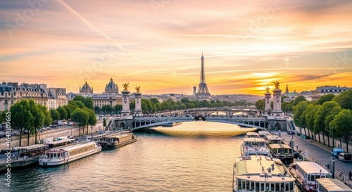 © Generative AI, Obraz premium Paris Cityscape at Sunset: Eiffel Tower and Alexandre III Bridge Over the Seine River