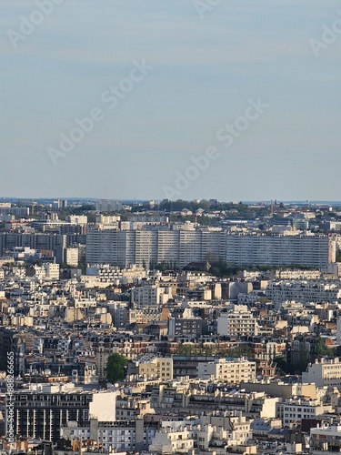 © yohananegusse, Obraz premium Paris, France - April 12, 2024: Aerial view of Paris skyline with dense urban sprawl and modern skyscrapers, Ile de France, France. Amazing mix between modern skyscraoers and old buildings.
