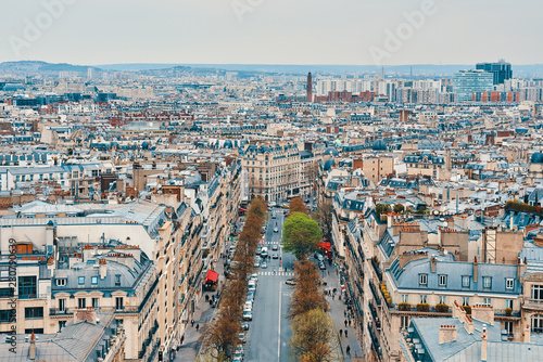 © badahos, Obraz premium PARIS, FRANCE -APRIL 9, 2018: View from the Arc de Triomphe to the city