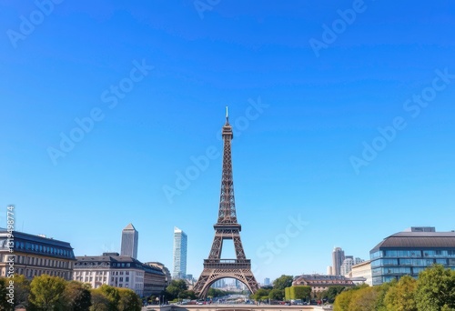 Fototapeta premium Paris skyline, modern architecture, clear blue sky, wide angle view, steel,...