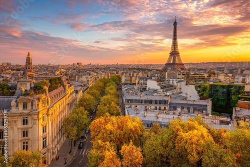 © Tali, Fototapeta premium Parisian cityscape at autumn sunset