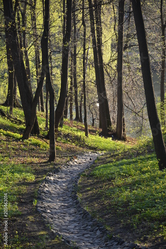 Naklejka premium Park alley walkway pathway trees spruce birch sky grove forest blue green...