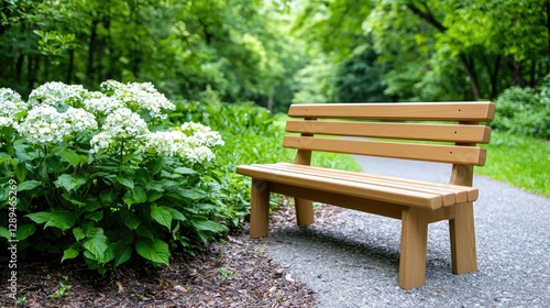 © KIMEHIME, Obraz premium Park bench beside path, tranquil scene, nature background, relaxing