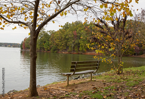 © kmm7553, Fototapeta premium Park bench by lake shore