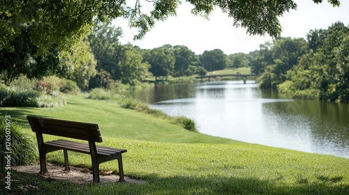 © tugkiara, Fototapeta premium Park Bench by River Under Trees