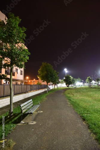 © FabriZiock, Fototapeta premium Park by Night with Bench Illuminated by Lamps