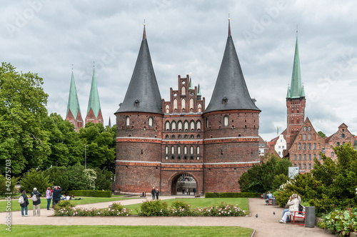 © dermerkur, Fototapeta premium Park mit Lübecker Holstentor