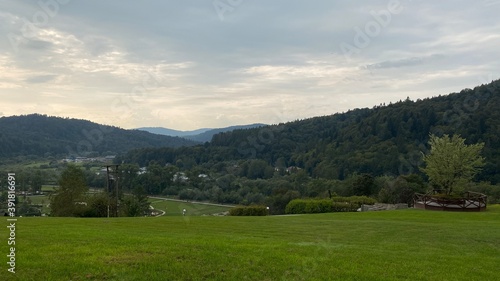 © Józef, Fototapeta premium Park Muszyna dużo zieleni i drzew oraz widokiem na góry Beskidu Sądeckiego