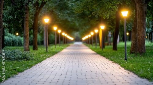 Obraz premium Park pathway at twilight with streetlights