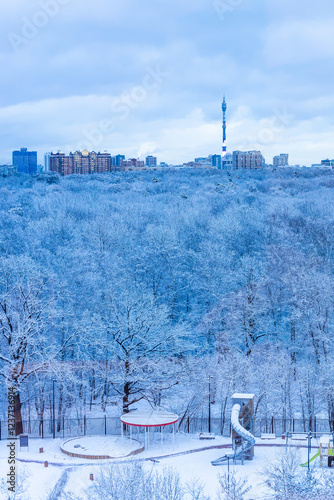 © vvoe, Fototapeta premium park, playground and town in blue winter dusk