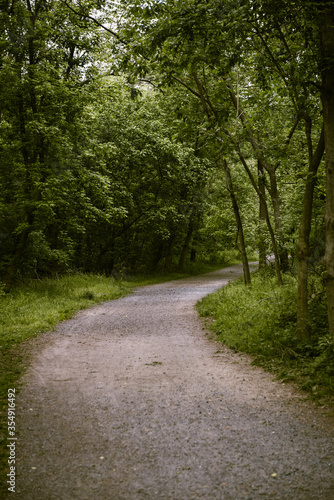 © JennDoesStock, Naklejka premium Park trail through woods.