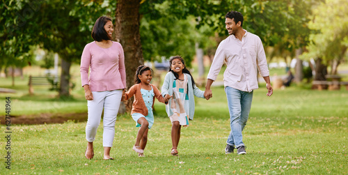 Obraz premium Park, walk and happy family holding hands, talking and bonding with love,...