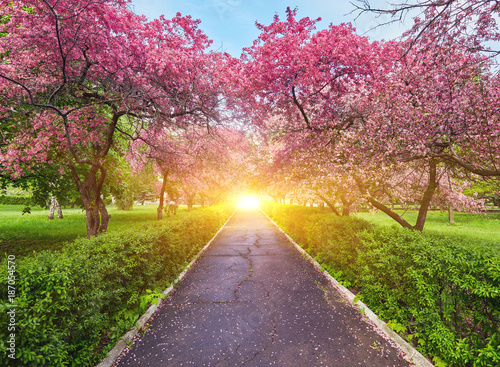 © Ryzhkov Oleksandr, Obraz premium Park with alley of blossoming red apple trees.