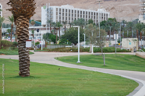 Obraz premium Park with well maintained green grass, winding pathways, modern street lamps and palm trees. In the distance, a sizable multi story building stands beneath a clear sky, urban and natural beauty